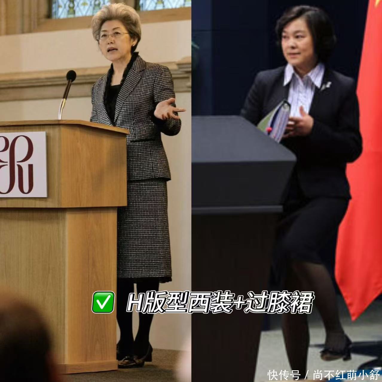 傅莹和华春莹的西装长期是正肩H型(肩线直挺不塌,腰部微收不紧身),搭配的裙长长期在膝盖下,不错很好的遮住大腿最粗处,瓦解小腿最细的脚踝,这些穿搭"小神思"你get到了吗?